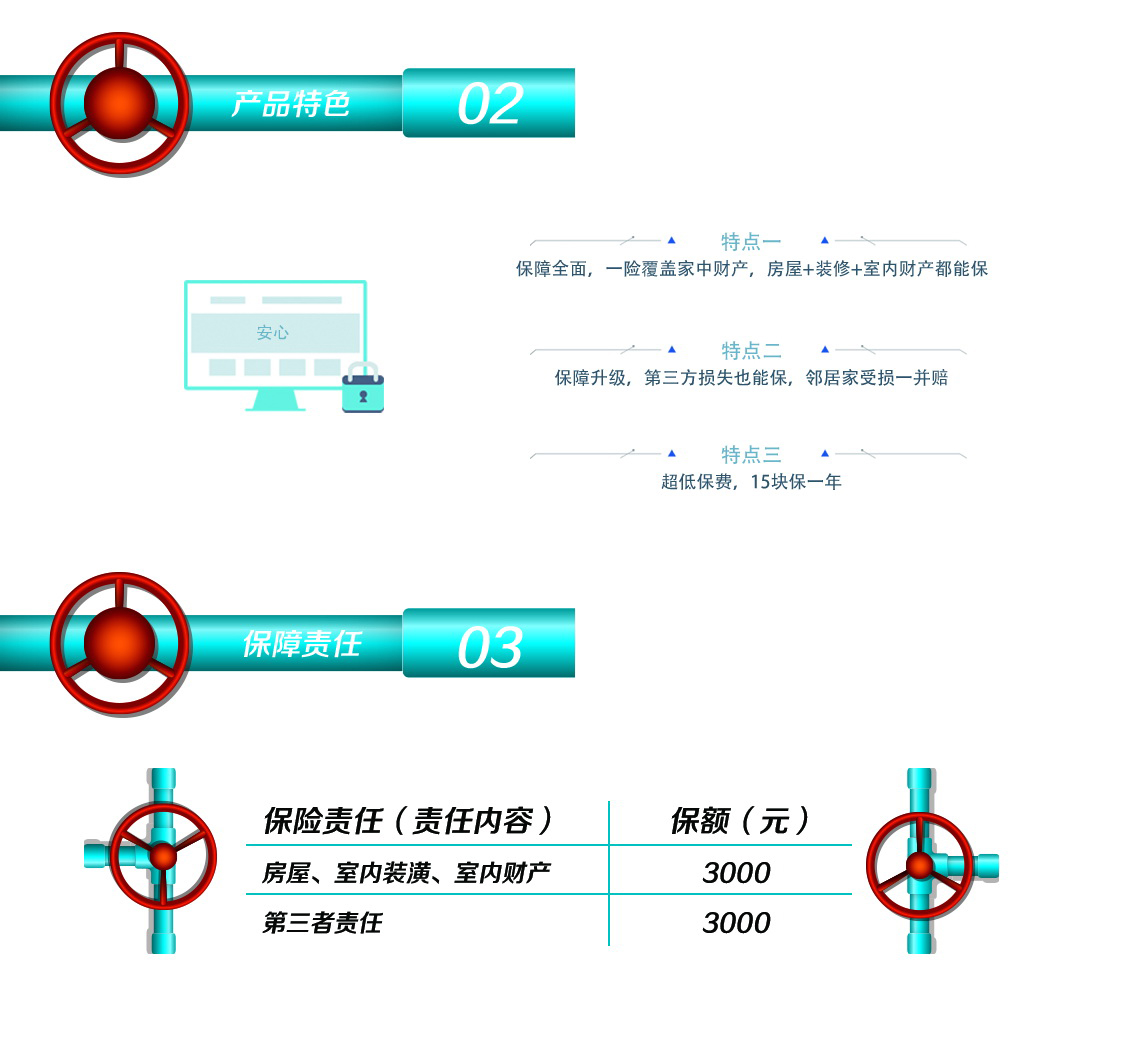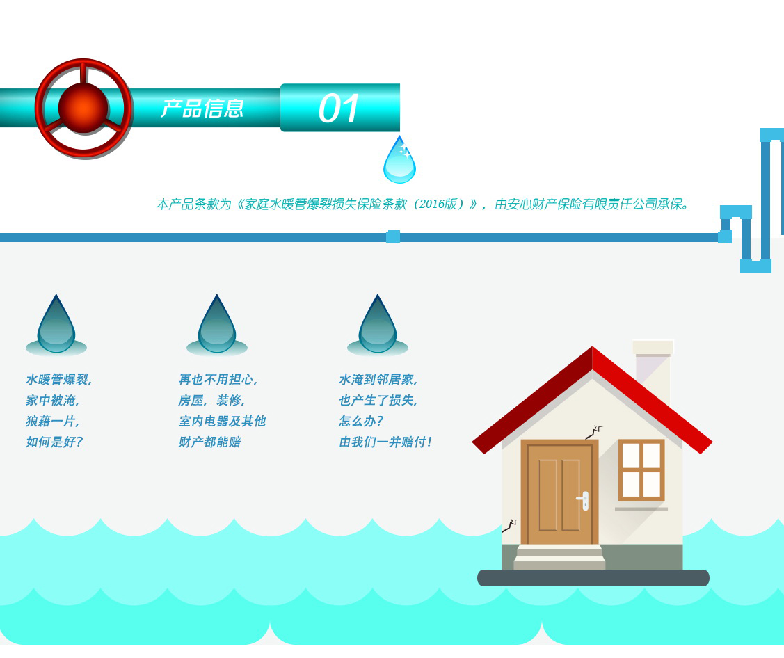 (9)投保本保险前,请投保人认真阅读产品页面展示内容以及《安心财产保险有限责任公司家庭水暖管爆裂保险条款》。如果您还有任何疑问,请详细阅读保险条款或拨打安心保险客户服务热线400-88-45678进行咨询。